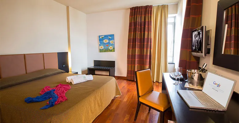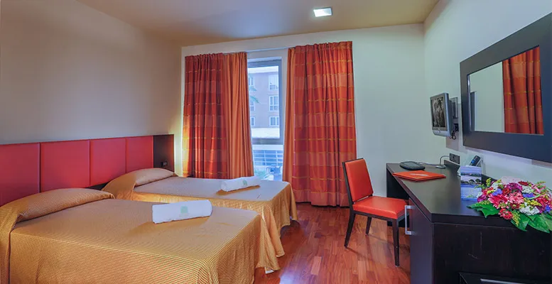 Camere più ampie ideali per famiglie o gruppi di amici, da scegliere tra due diverse tipologie a tre letti oppure matrimoniale + letto. Arredate in stile moderno, parquet, finestre insonorizzate, vista città o parco piscine o giardino interno, servizi privati con doccia o vasca idromassaggio (vasca monoposto), TV satellitare con schermo a plasma, connessione internet WI-FI FREE, Cassaforte elettronica, Frigobar (consumazioni da pagare in loco), Aria condizionata regolabile autonomamente, telefono diretto, asciugacapelli, set cortesia.